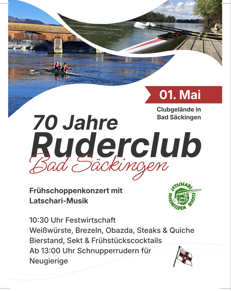 Der Ruderclub Bad Säckingen wird 70 Jahre alt, und das möchten wir gemeinsam mit euch und vielen Gästen gebührend feiern. Für die Ausrichtung unseres Jubiläumsfestes am Freitag 1. Mai sind wir auf die Unterstützung aller Mitglieder angewiesen. An diesem Tag wird auch Schnupperrudern angeboten.